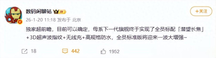 2026年1月20日,据博主“数码闲聊站”爆料,母系下一代旗舰将迎来配置全面升级,潜望长焦、3D超声波指纹、无线充电及高规格防水功能将实现全系标配,标准版也将迎来“大增强”。